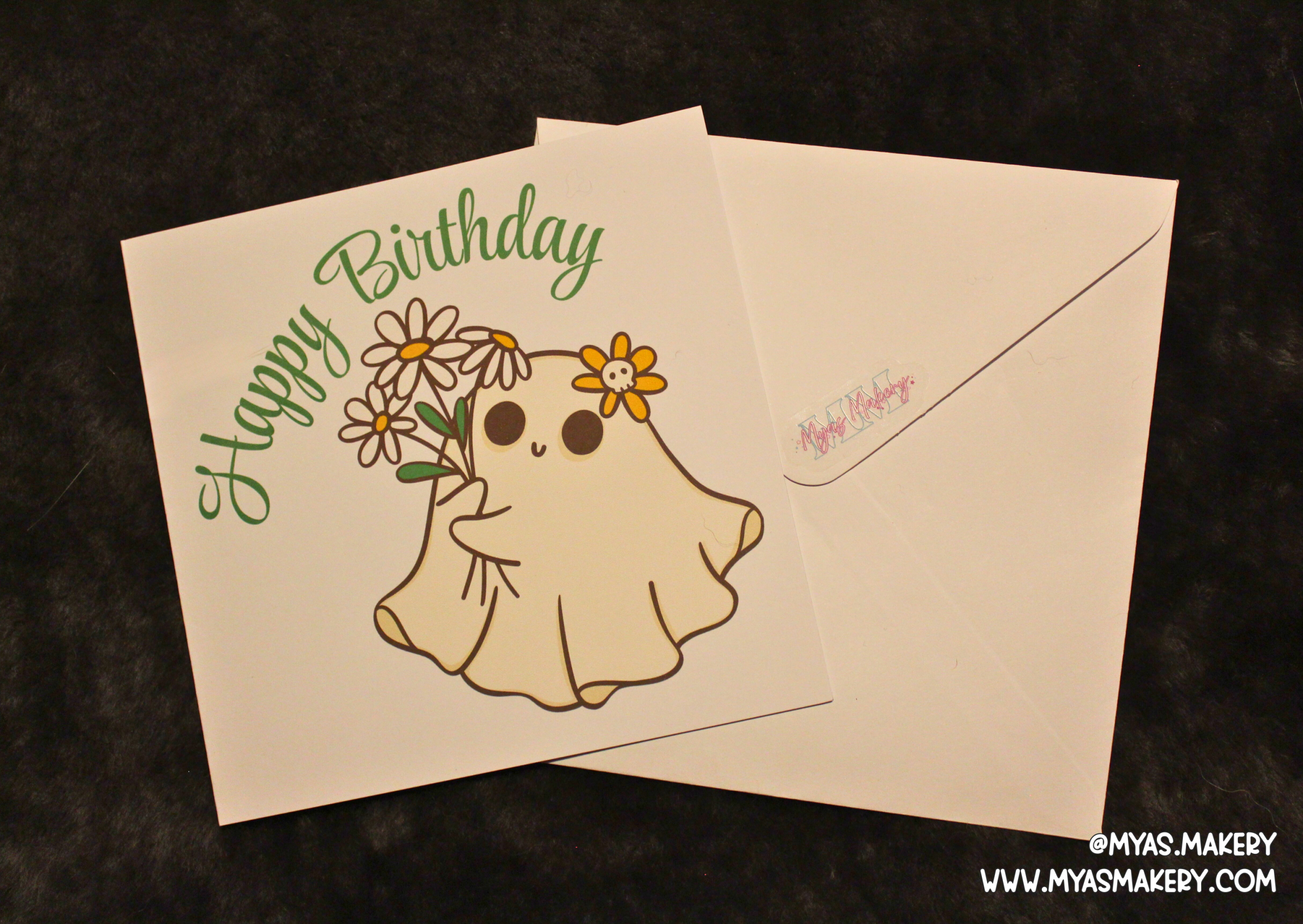 Printed on high‑quality 6×6 cardstock, the card is blank inside so you can write your own heartfelt, funny, or spooky‑sweet message. It’s perfect for fans of cute ghost aesthetics, pastel‑spooky vibes, or anyone who loves a birthday card with personality and charm.
