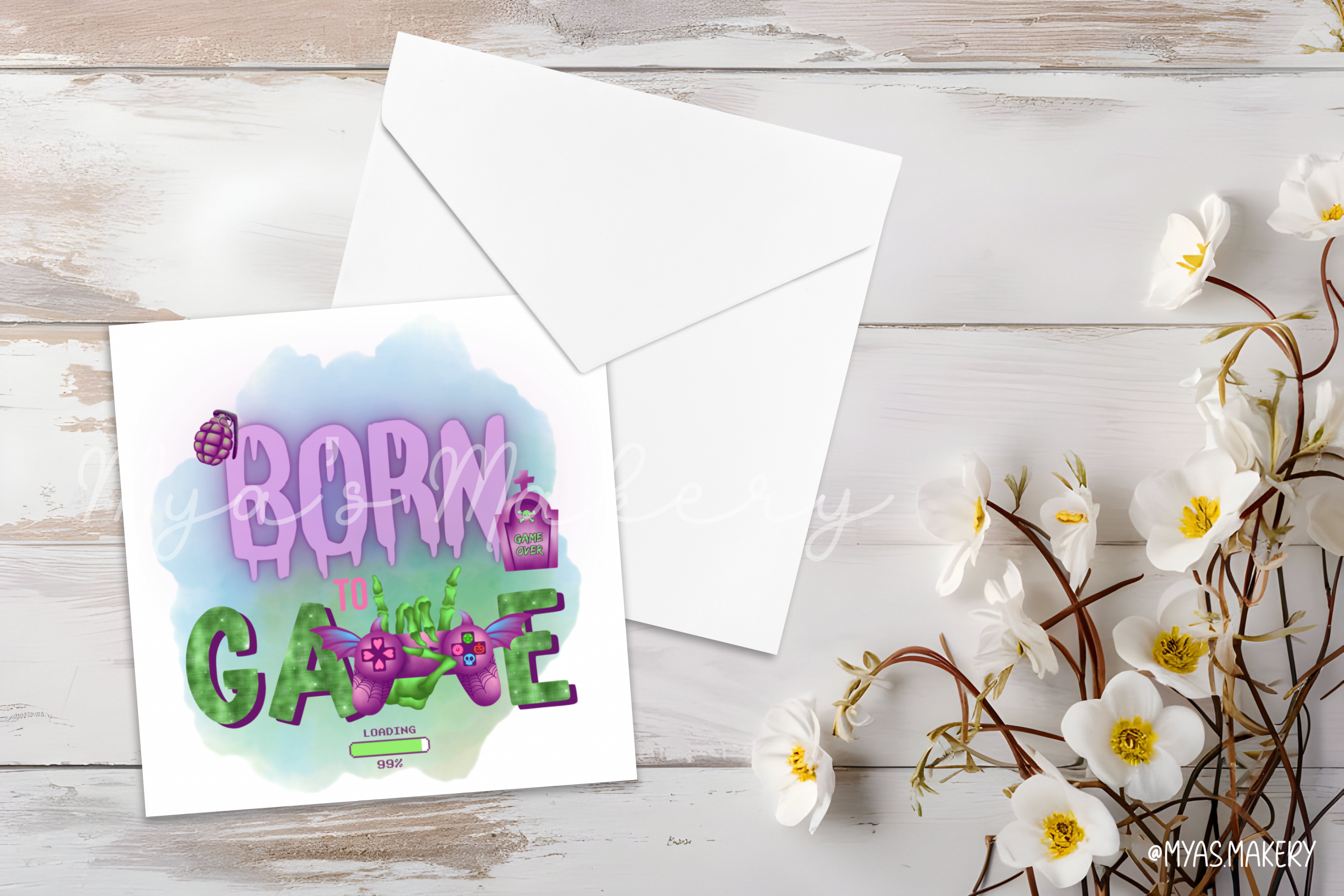 Gaming isn’t just a hobby; it’s a lifestyle. Our “Born to Game” Illustrated Square Card captures that energy with a bold, multi-layered design that feels like it jumped straight off a digital screen. Featuring neon purples and slime greens, the artwork includes iconic symbols like a grenade, a “Game Over” headstone, and a loading bar that’s almost there—perfect for the friend who always says “one more round.”