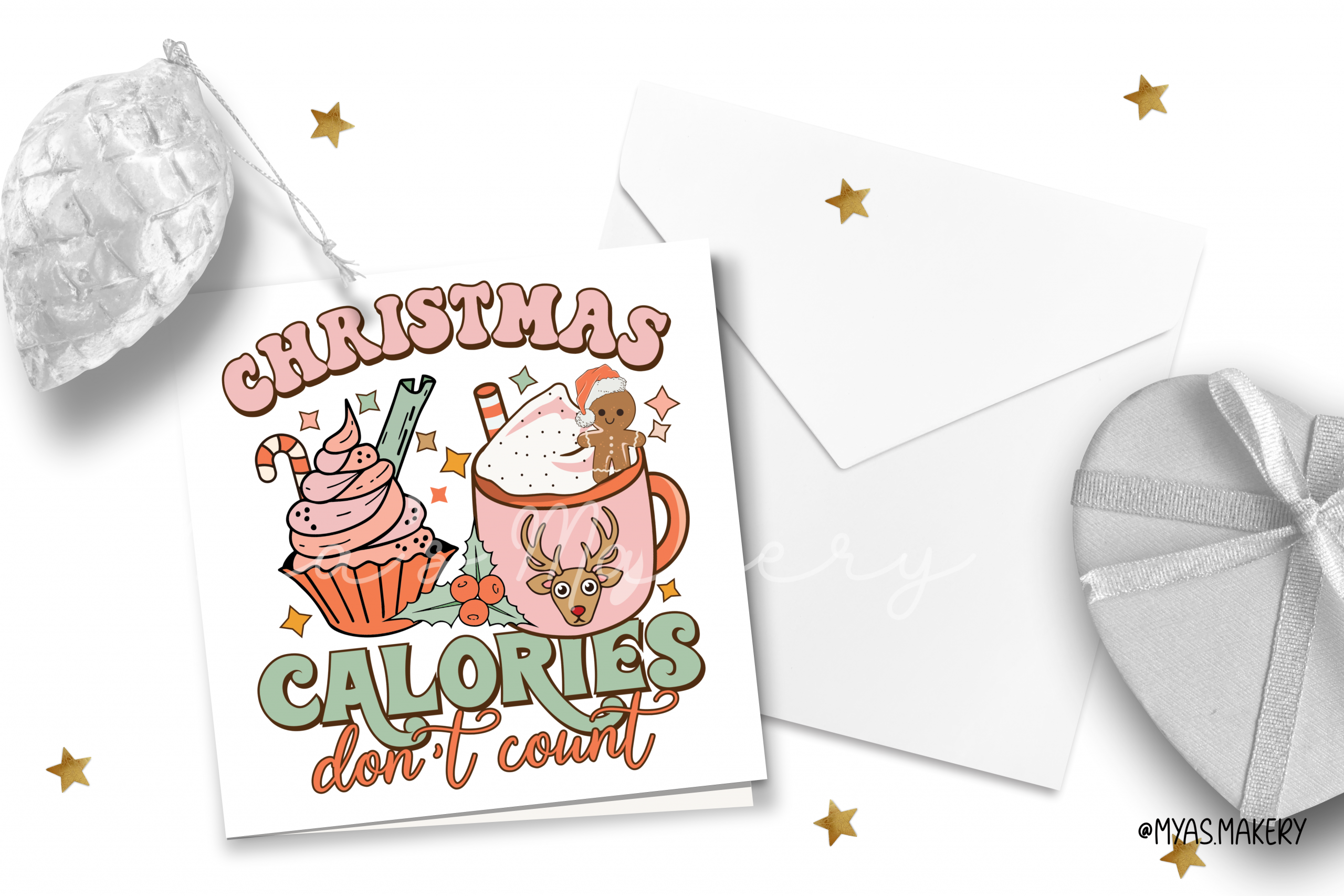 - Playful Retro Details: The bold, “puffy” 70s-style lettering is paired with charming illustrations of a pink-frosted cupcake topped with a candy cane and a reindeer mug overflowing with cocoa and a smiling gingerbread man.