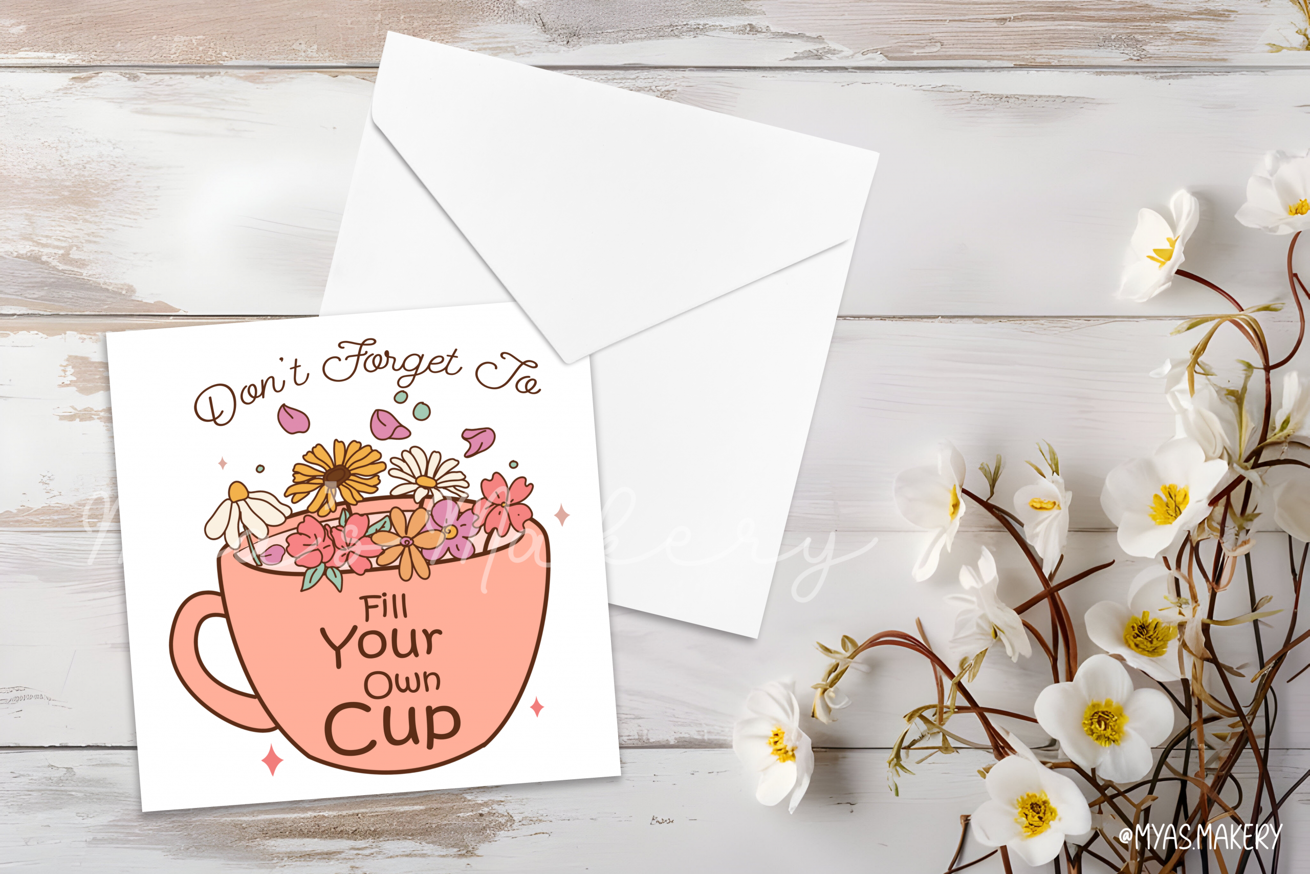 Self-love is an essential, not a luxury. Our “Fill Your Own Cup” Illustrated Square Card captures the beauty of taking a moment for yourself. The design features a cozy peach-coloured mug filled to the brim with a lush variety of daisies and wildflowers, symbolising the growth and beauty that comes from self-nourishment.