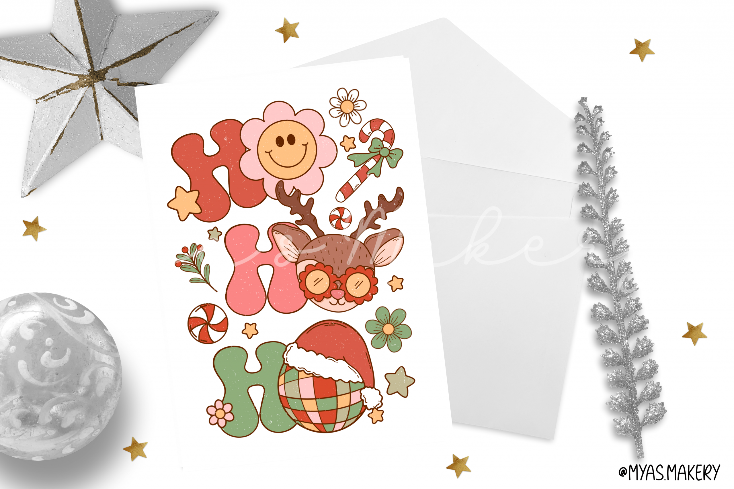 - Eclectic Maximalist Detail: The artwork features a whimsical reindeer wearing oversized floral glasses, flanked by a groovy “Ho Ho Ho” stack. Every corner is filled with 70s-inspired charms, including peppermint candies, smiley-face daisies, and mid-century stars.