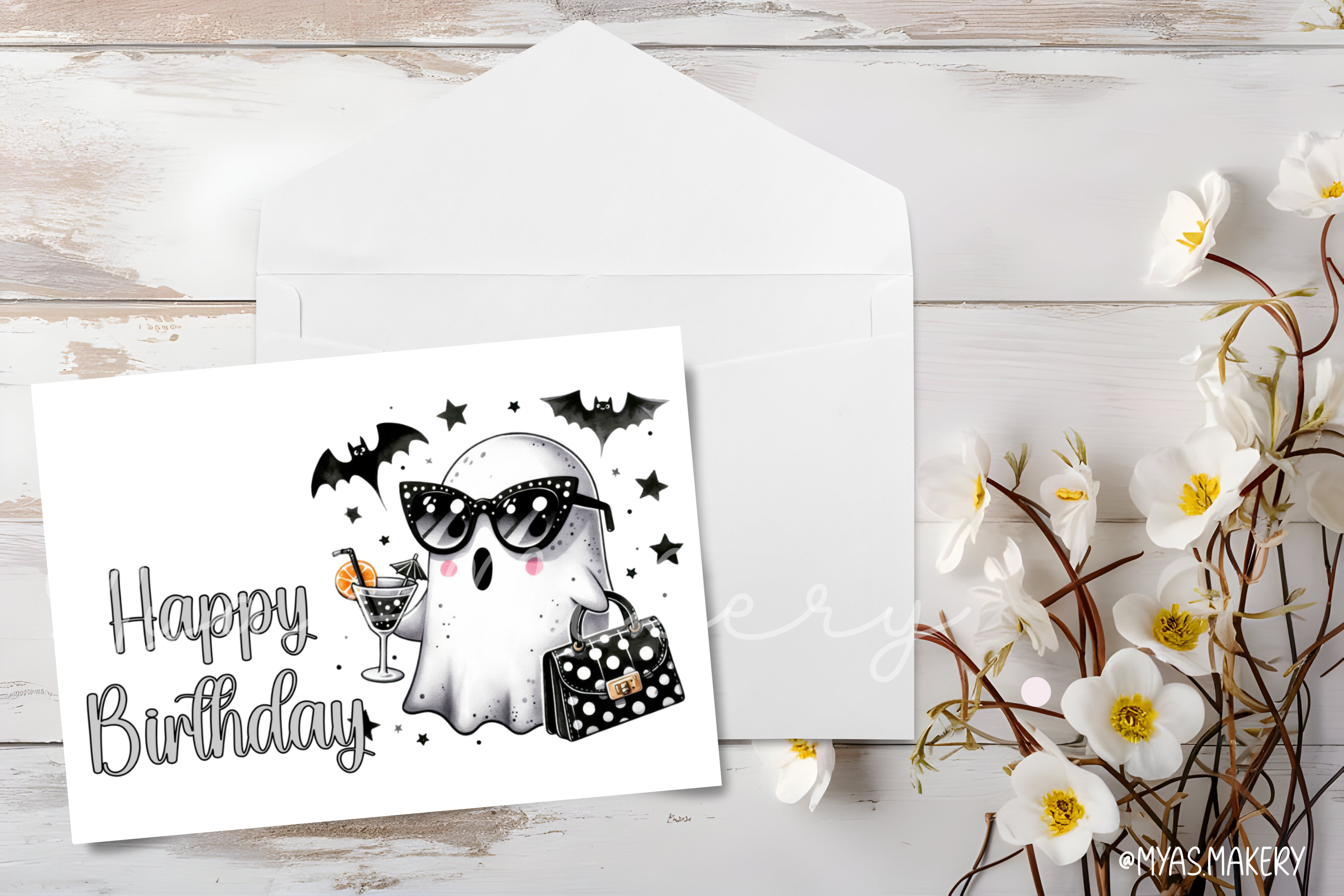 The card showcases a delightful illustration of a friendly ghost carrying shopping bags, bringing a fashionable twist to the supernatural. Each card is printed on premium cardstock, ensuring your birthday message is delivered with quality and charm. The classic C6 format provides plenty of space for your personal message while maintaining a fun and stylish appearance.