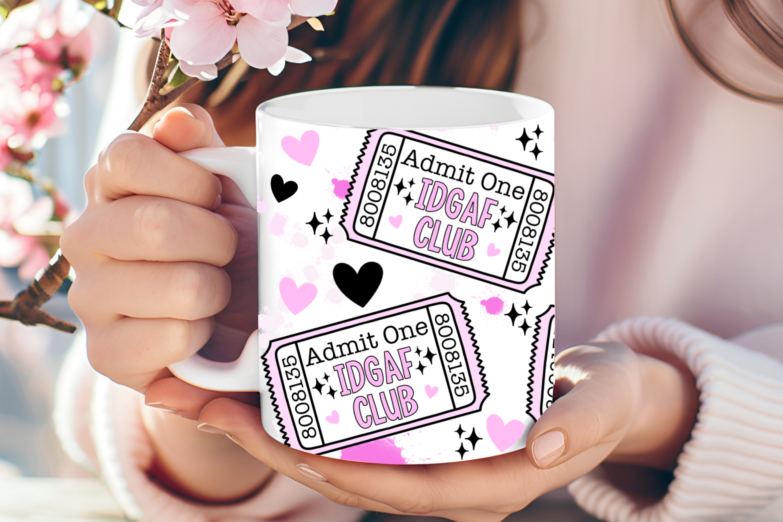 - All-Over Pattern: This isn’t just a single logo; the mug is covered in a playful pattern of tickets, scattered hearts, and Y2K-inspired star sparkles for a high-energy, maximalist look.