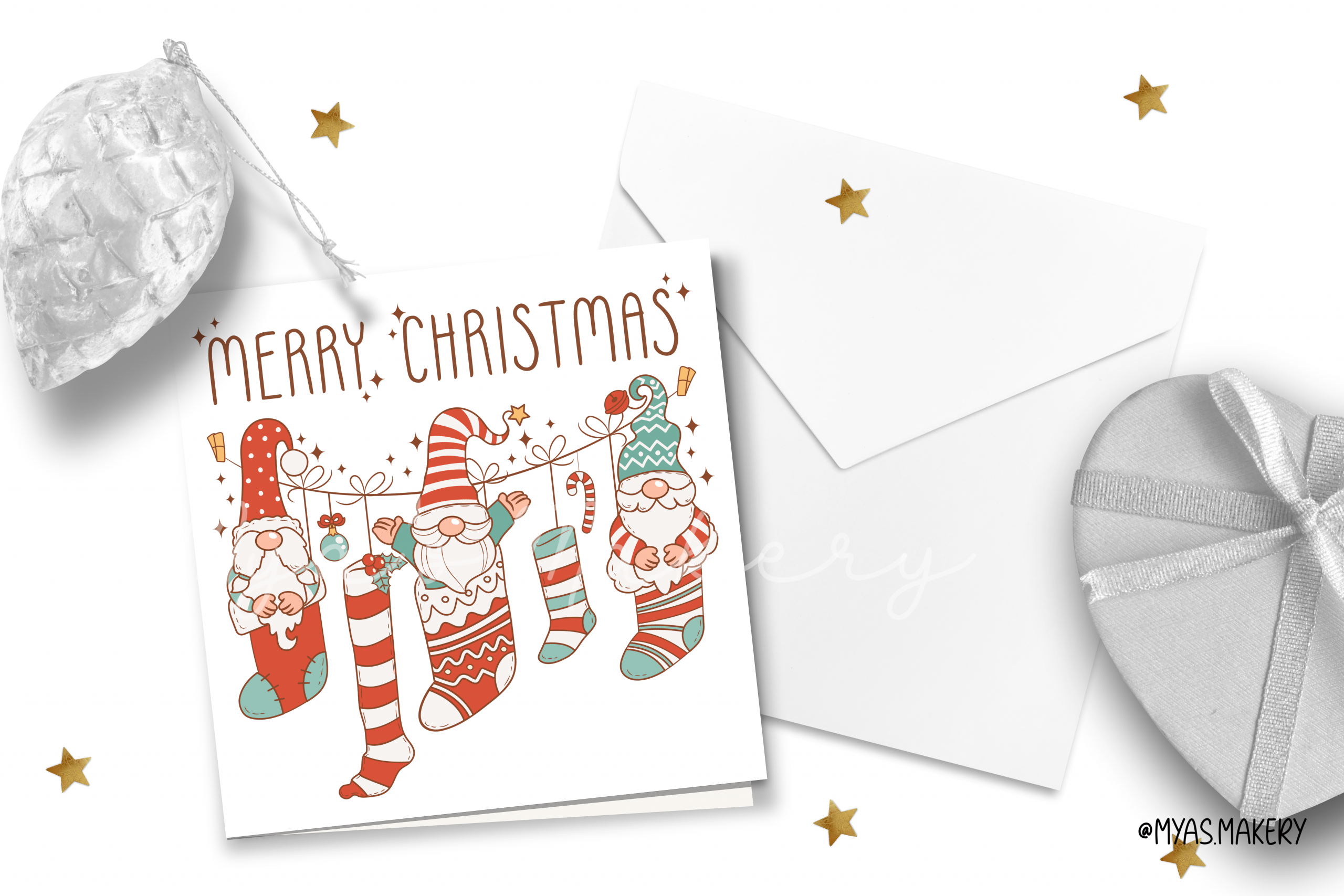 - Charming Character Art: Each gnome and stocking is uniquely designed with playful patterns like stripes, polka dots, and snowflakes, giving the card a high-end, boutique feel.