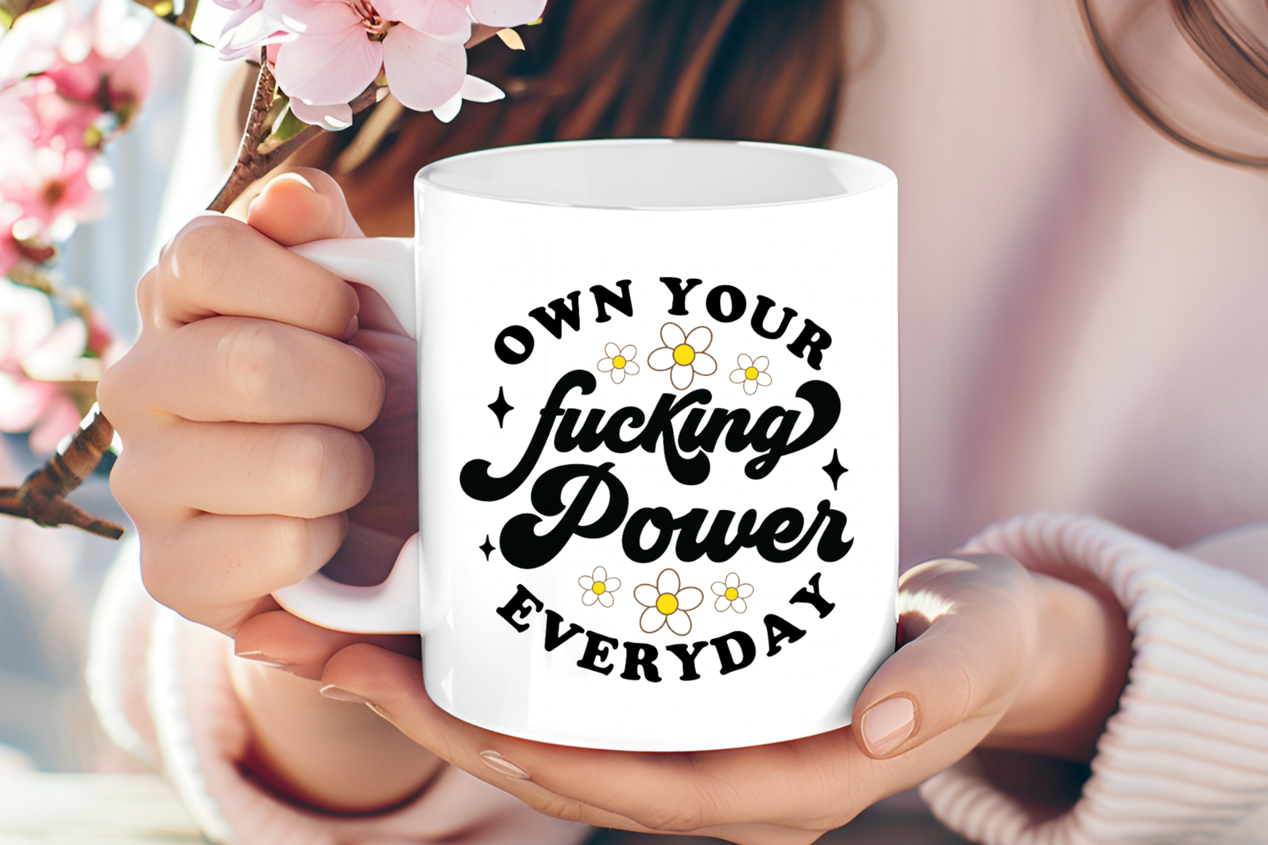 • Design: Bold “Own Your F*cking Power Everyday” with daisies.