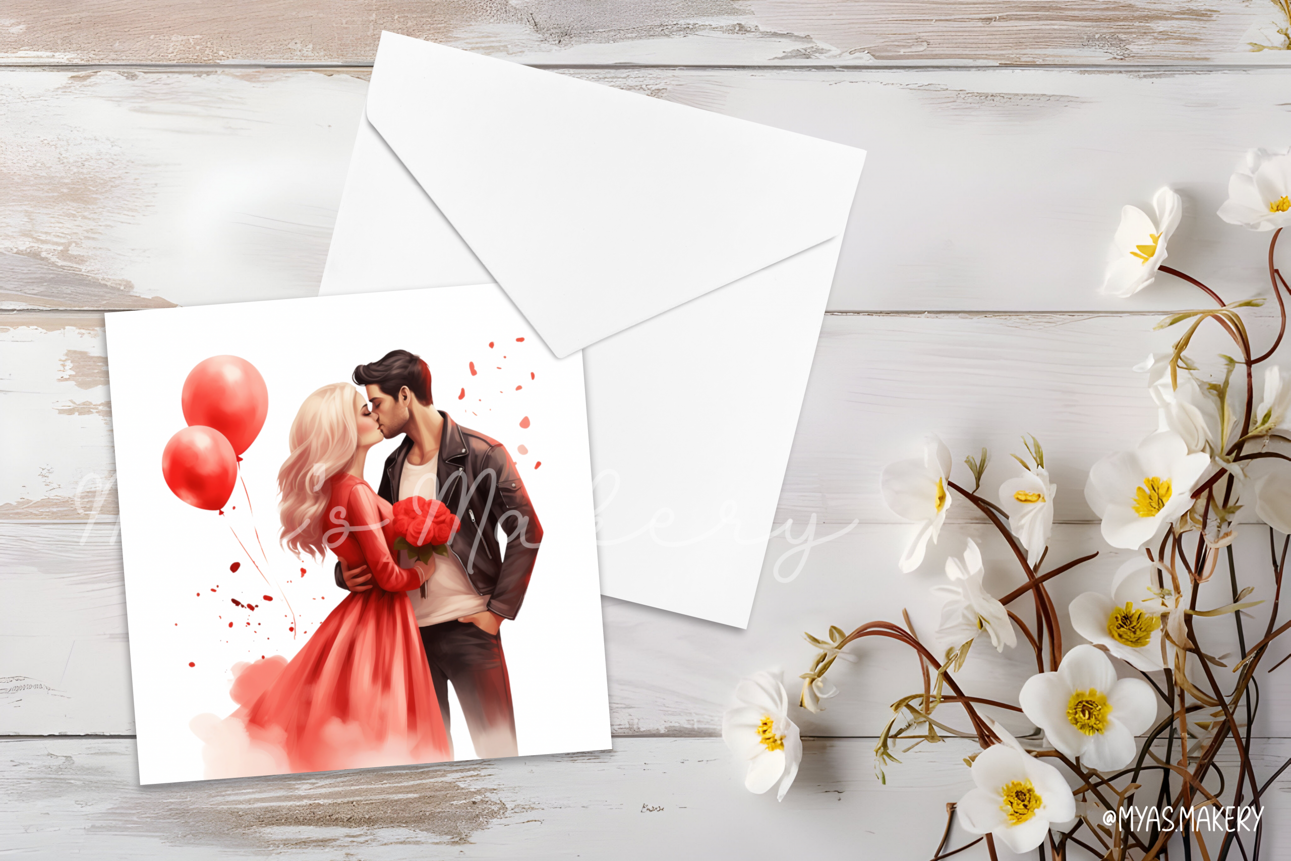 Our “Romantic Embrace” Illustrated Square Card features a modern, painterly scene of a couple lost in a moment of affection. With bold pops of crimson from the floating balloons and a lush bouquet of roses, this design balances contemporary style with classic romantic imagery.