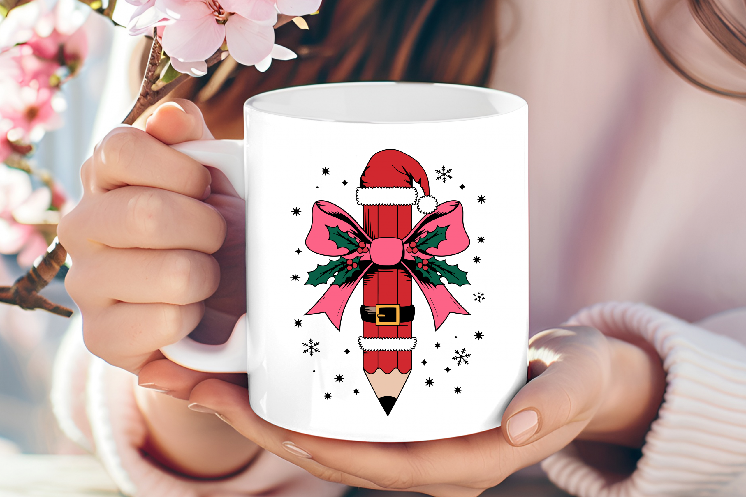 • Whimsical Bow: A large, dapper pink bow with green holly leaves and red berries is tied around the pencil, adding a trendy “coquette” touch to the design.