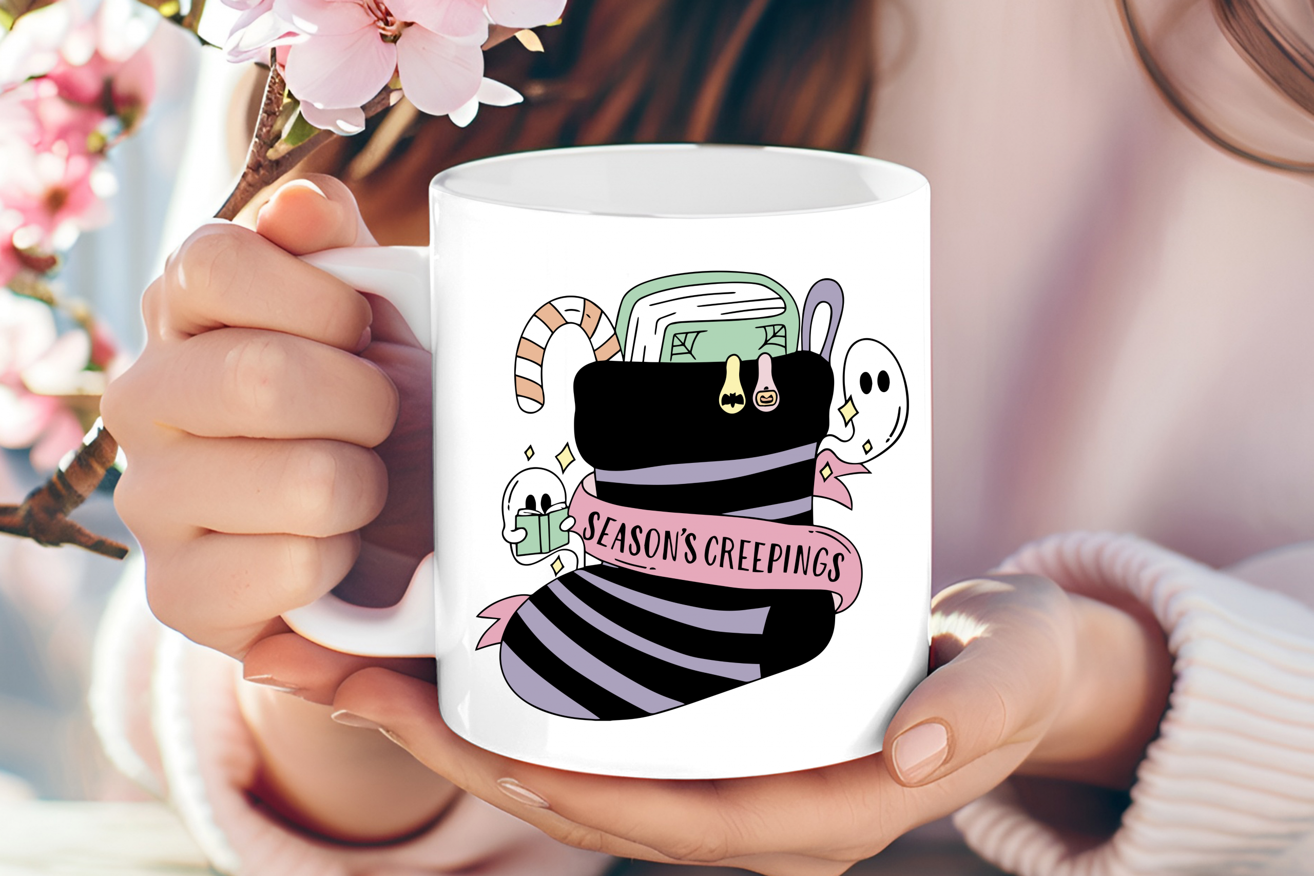Who says the spooky season has to end in October? Our “Season’s Creepings” mug is designed for the ghouls and ghosts who prefer cobwebs to tinsel and hauntings to carolling.