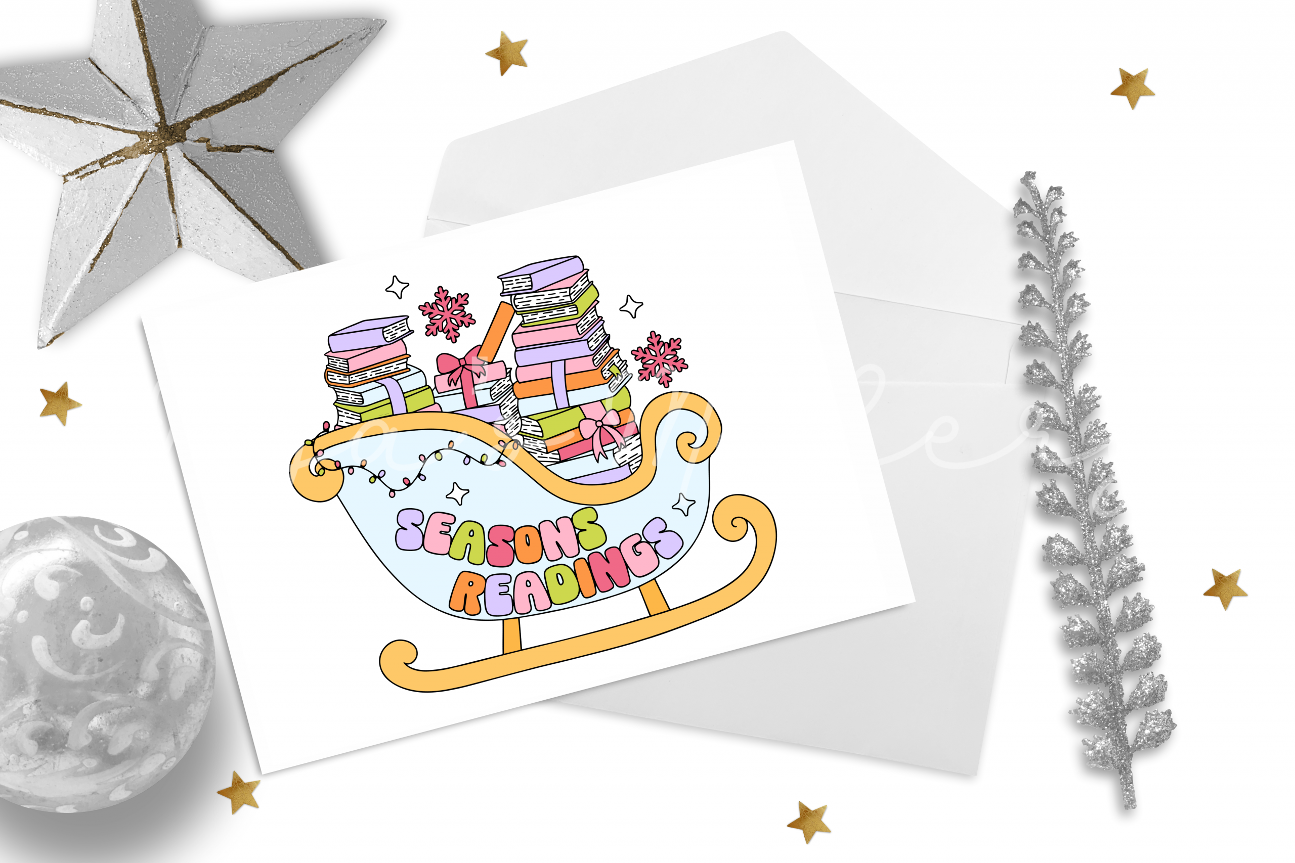- Playful Punny Typography: The “Seasons Readings” message is rendered in a fun, multi-coloured bubble font that adds a touch of retro personality to the design.
