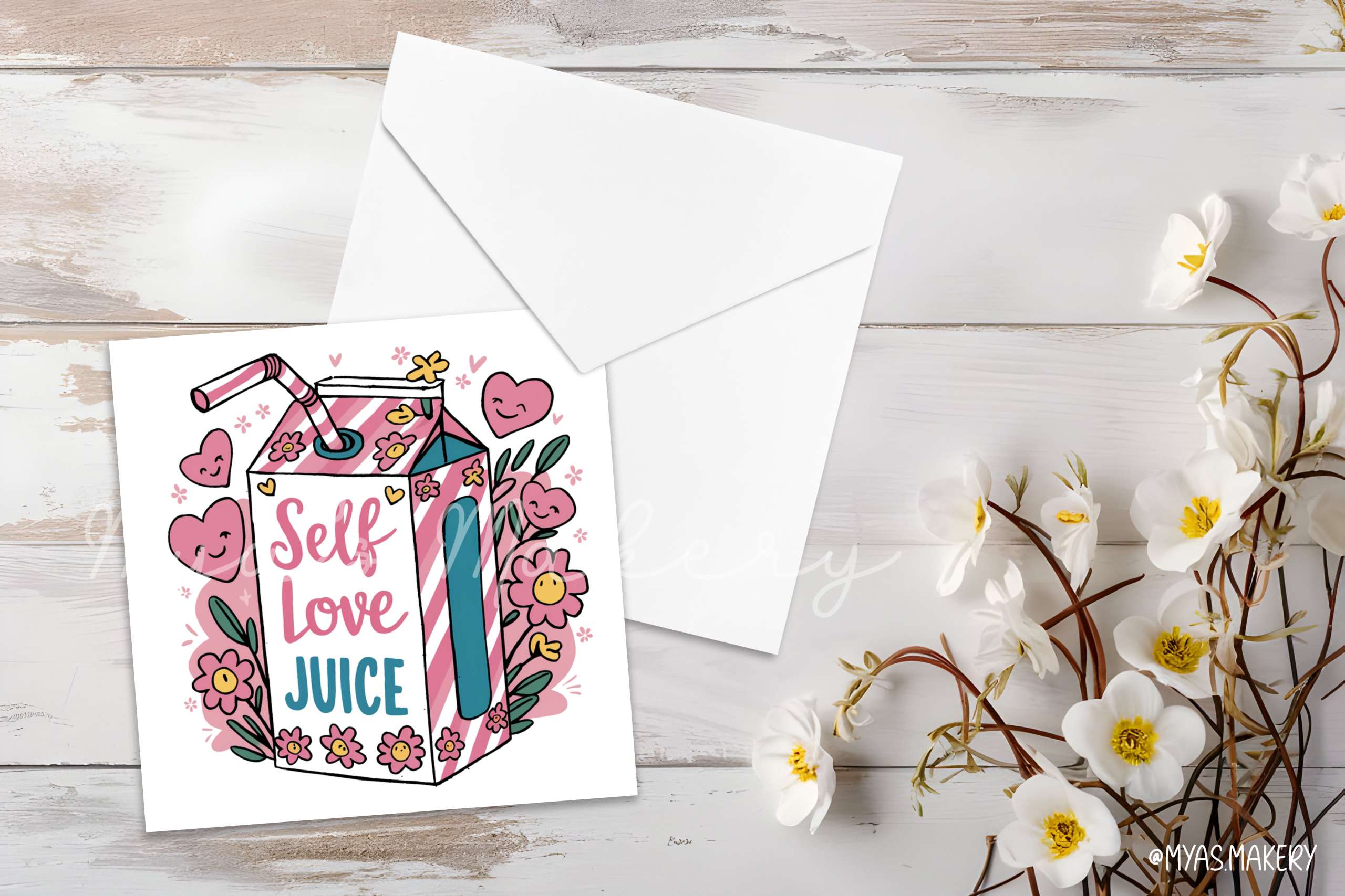 Because the most important relationship you have is with yourself. Our “Self Love Juice” Illustrated Square Card is a masterclass in whimsical encouragement. The design features a retro-style juice carton with a striped straw, adorned with “Self Love Juice” in a mix of soft script and bold teal typography. Floating around the carton are smiling hearts and vibrant pink flowers, creating a sense of joy and abundance.
