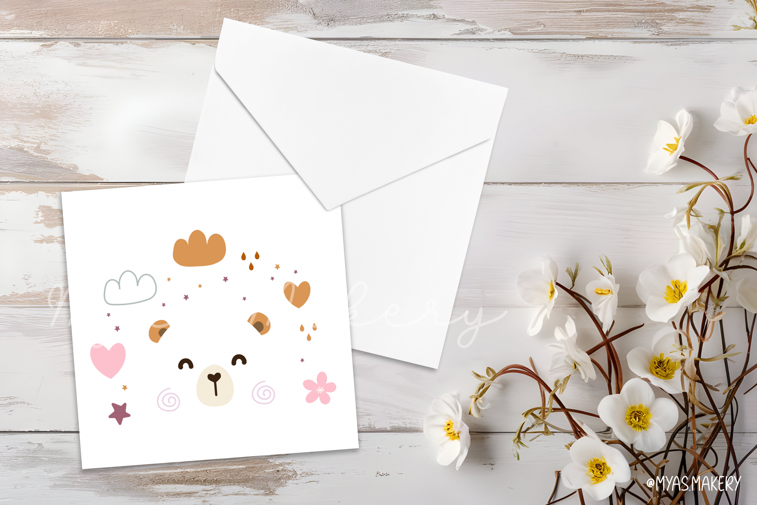 Our “Sweet Dreams” Bear Illustrated Square Card captures the innocence and wonder of childhood. The design features a minimalist bear face with a gentle smile, surrounded by a whimsical constellation of tiny stars, raindrops, hearts, and soft clouds in a calming palette of tan, pink, and muted grey.