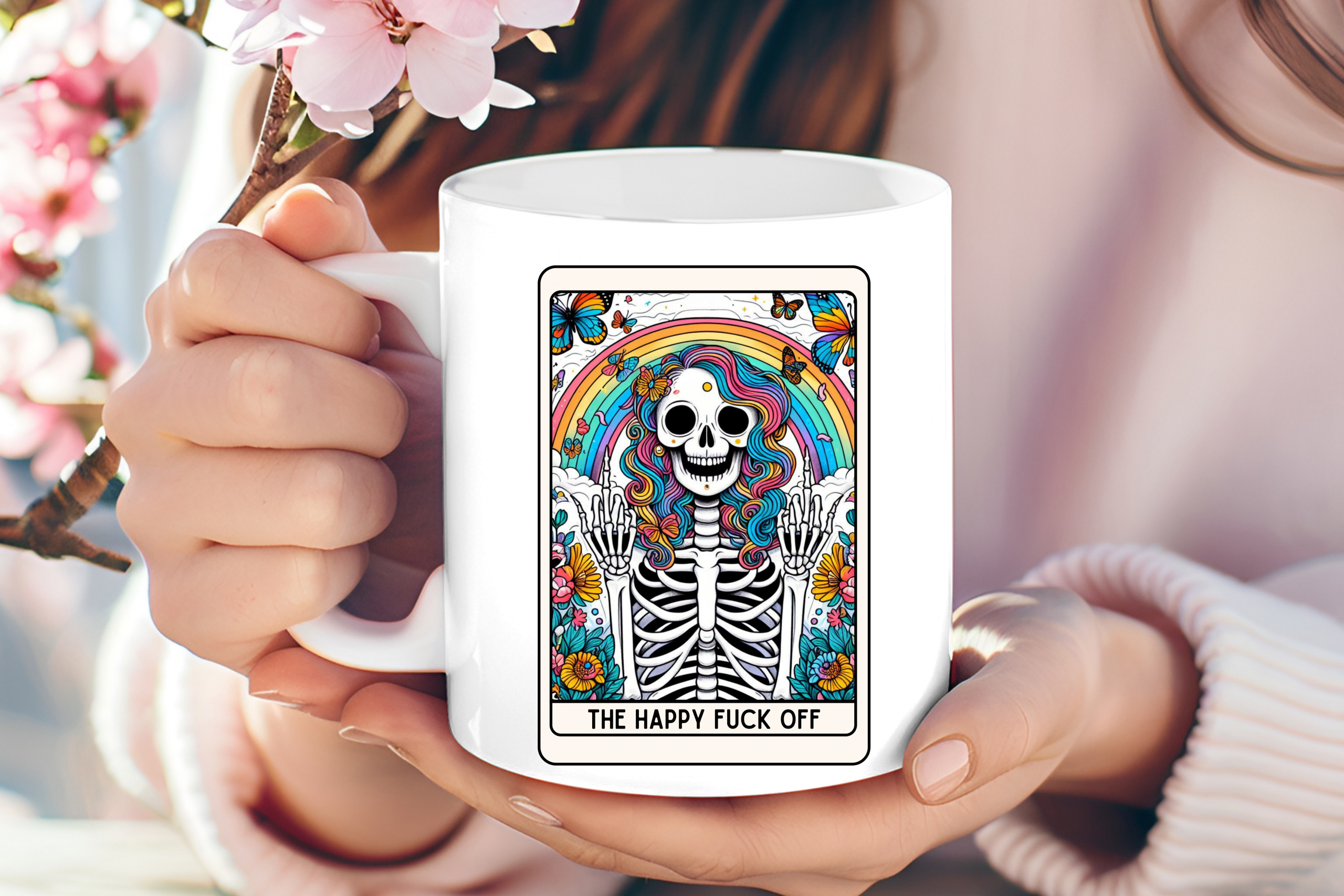 The Design: Presented in a classic tarot card layout, the centrepiece features a skeletal figure with flowing, multi-coloured hair and a serene, smiling expression. Standing beneath a vivid rainbow and flanked by blossoming flowers and fluttering butterflies, the skeleton holds a playful, defiant gesture that perfectly captures “The Happy Fuck Off” energy. The neon-bright palette and intricate line work turn every sip into a moment of defiant joy.