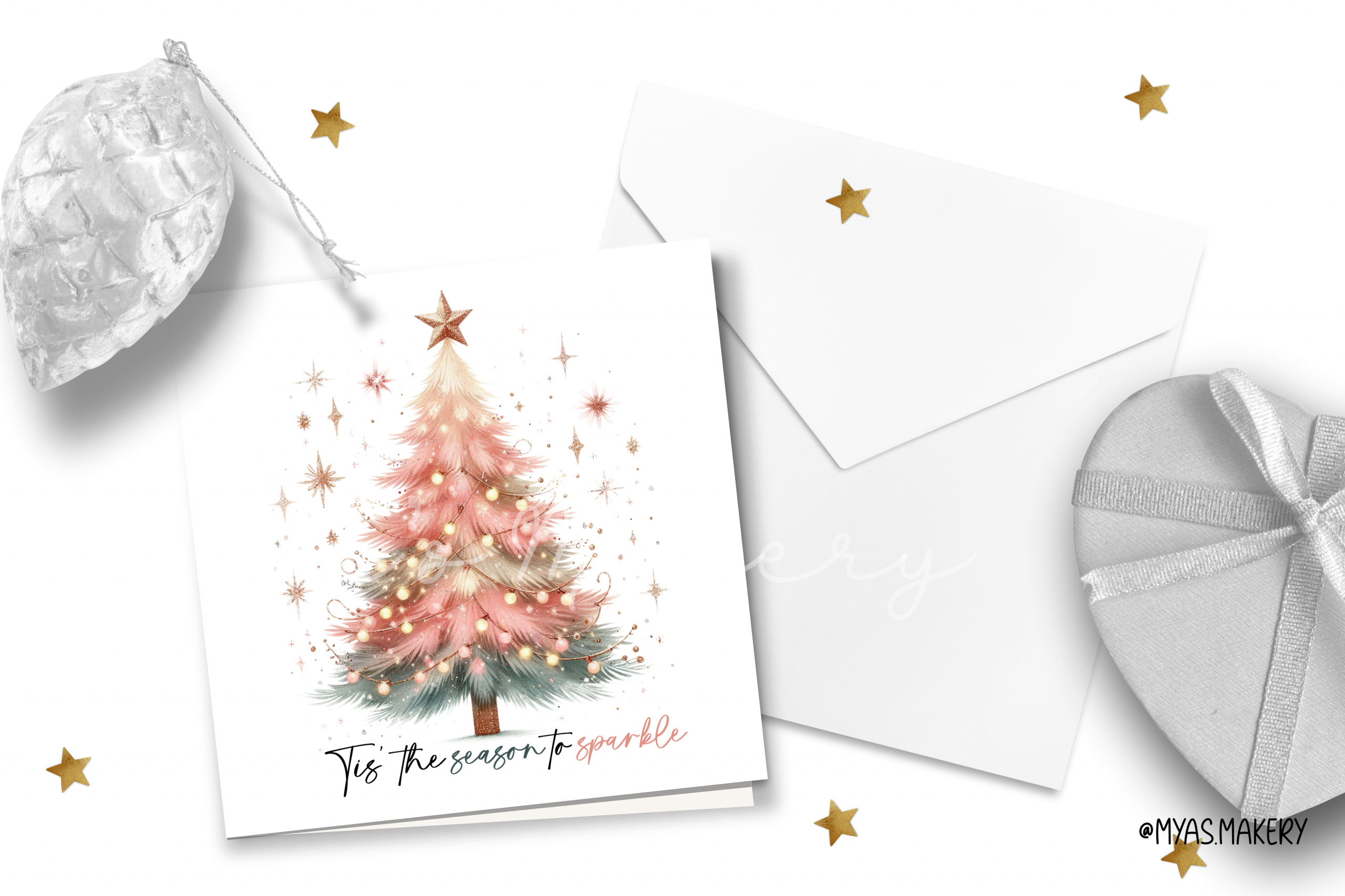 Our “Tis’ the Season to Sparkle” Illustrated Square Card captures the ethereal beauty of a perfectly lit Christmas tree. Moving away from traditional bold primary colours, this design features a breathtaking watercolour-style tree that transitions from soft sage at the base to a glowing rose-gold at the peak, topped with a shimmering golden star.