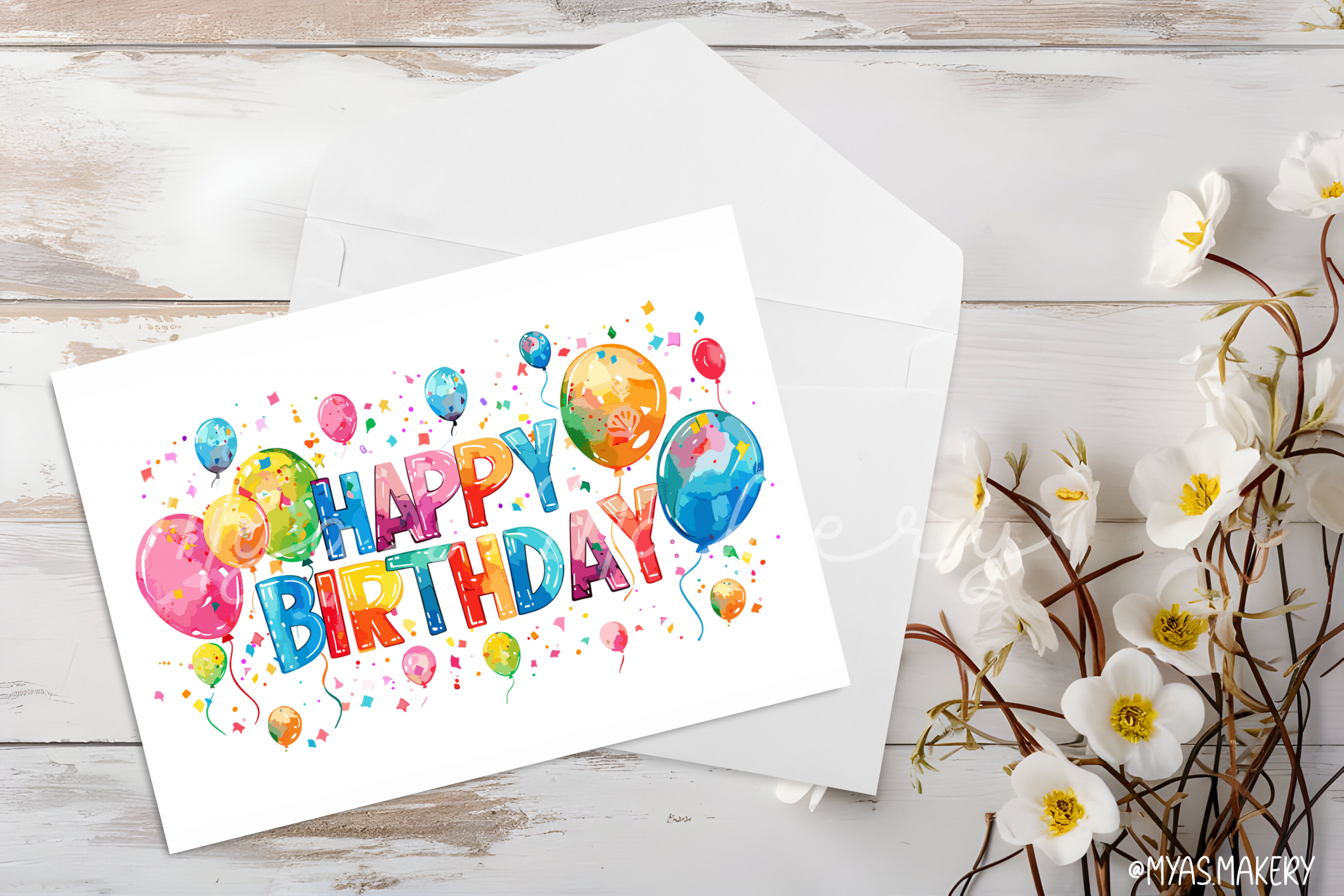 • Bold Rainbow Typography: The “Happy Birthday” message is rendered in large, multi-coloured letters with a soft white outline, ensuring the sentiment stands out perfectly against the festive confetti-filled background.